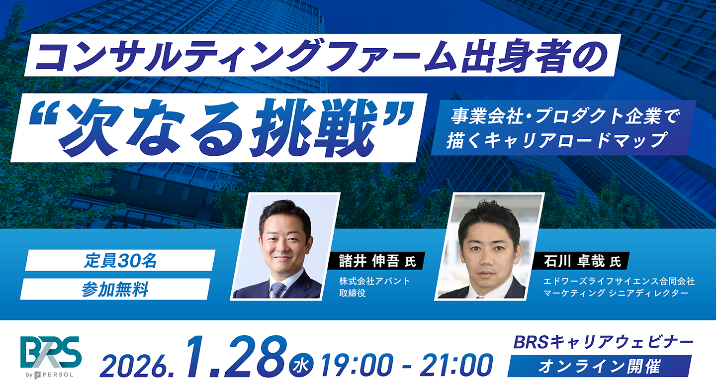 パーソルキャリアBRSが、エドワーズライフサイエンス合同会社、株式会社アバントと共同で、コンサルティングファーム経験者の方を対象にしたキャリアセミナーを開催します。